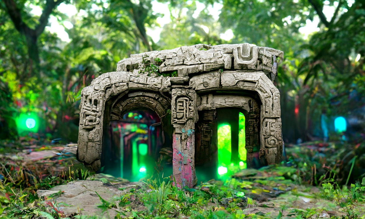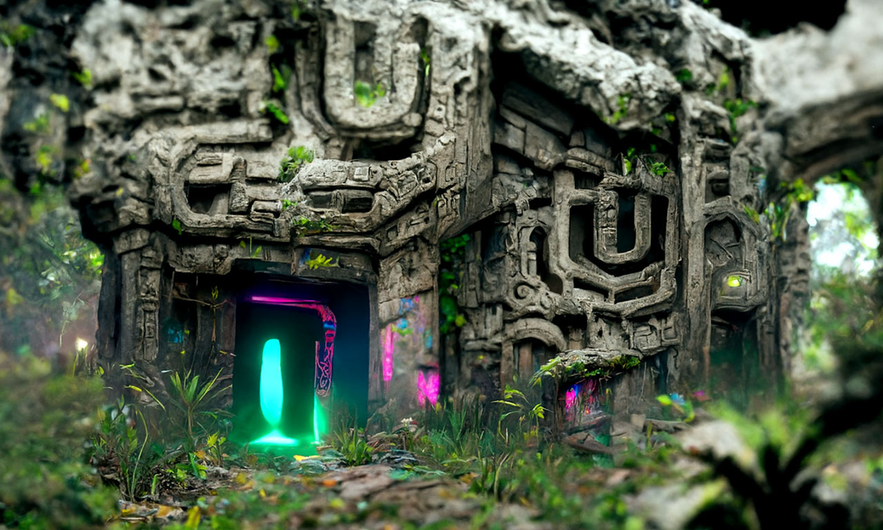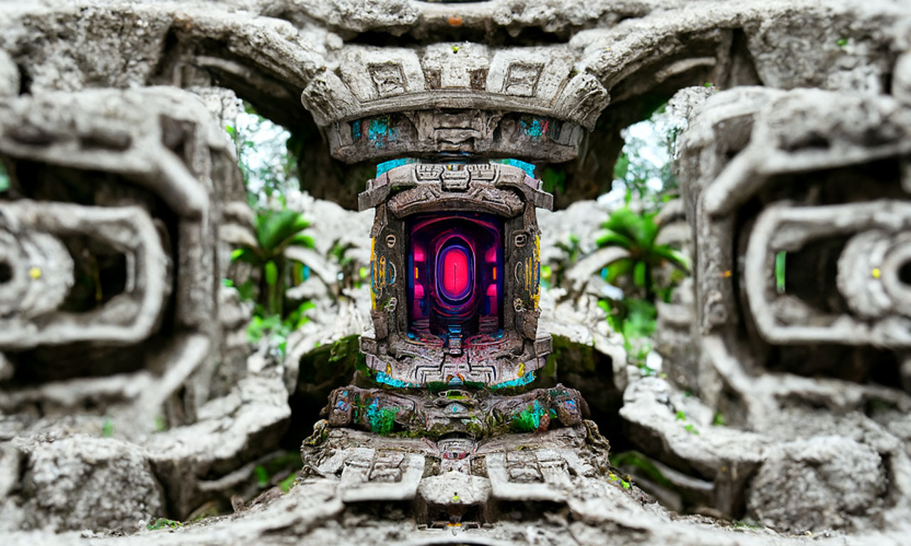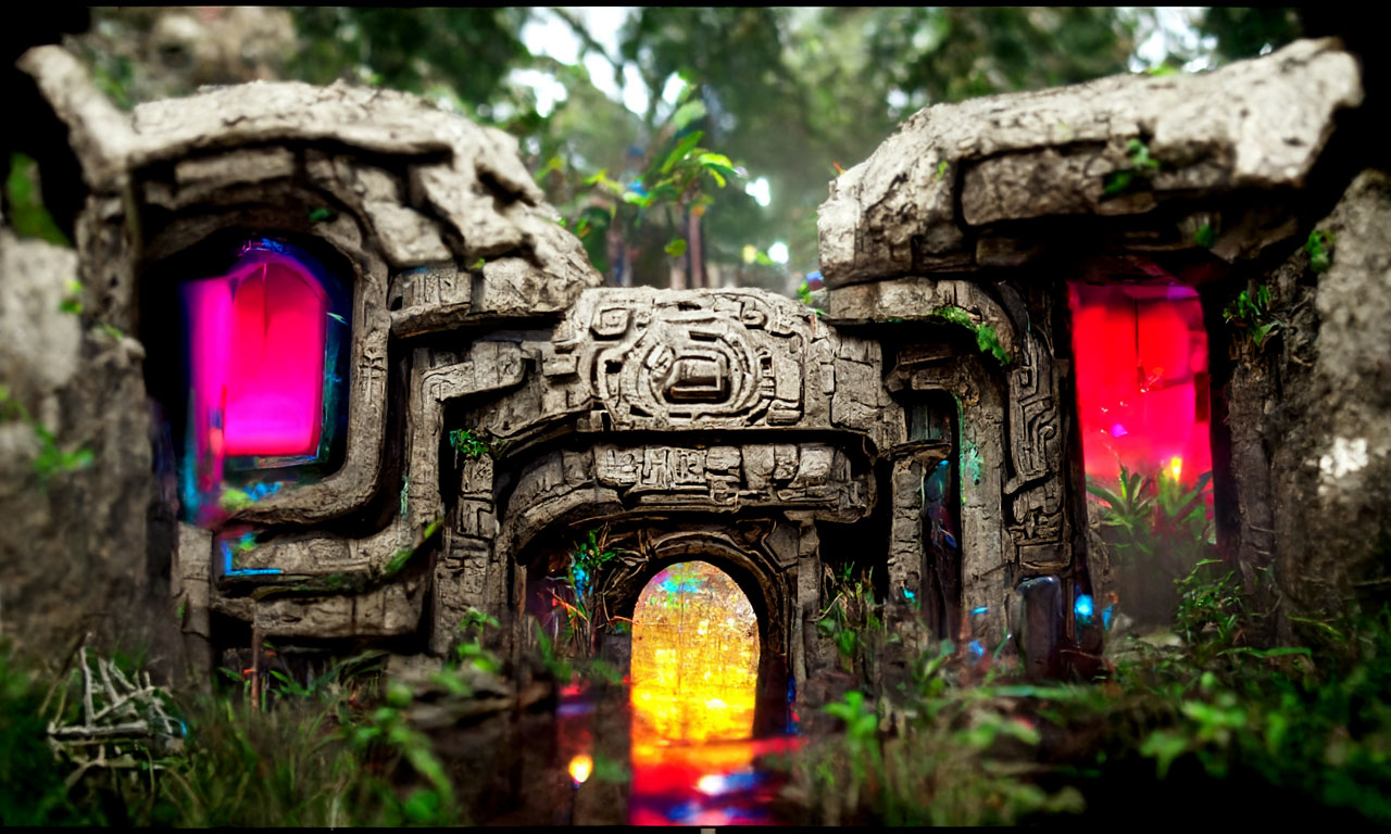 Prompt: Detailed neon portal to another universe, Aztec Ruins in the jungle by Tyler Edlin trending on Artstation ultra HD, Unreal Engine