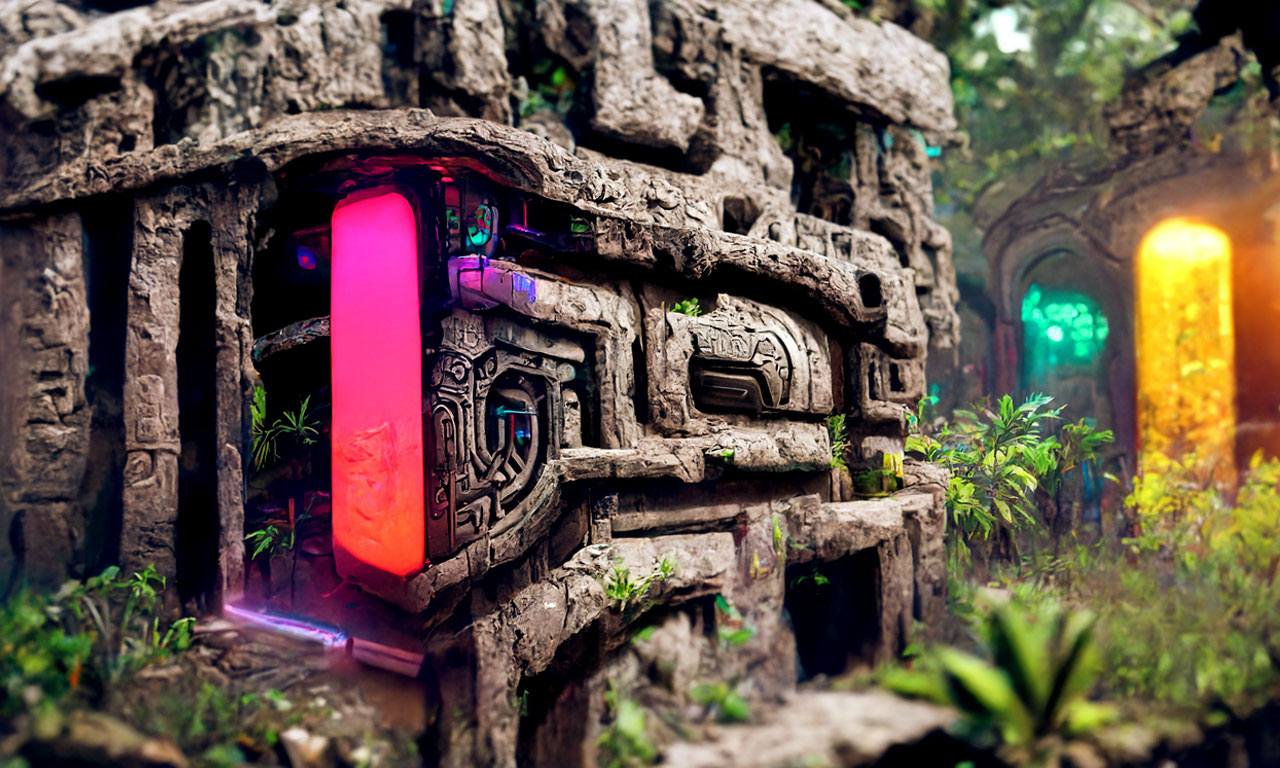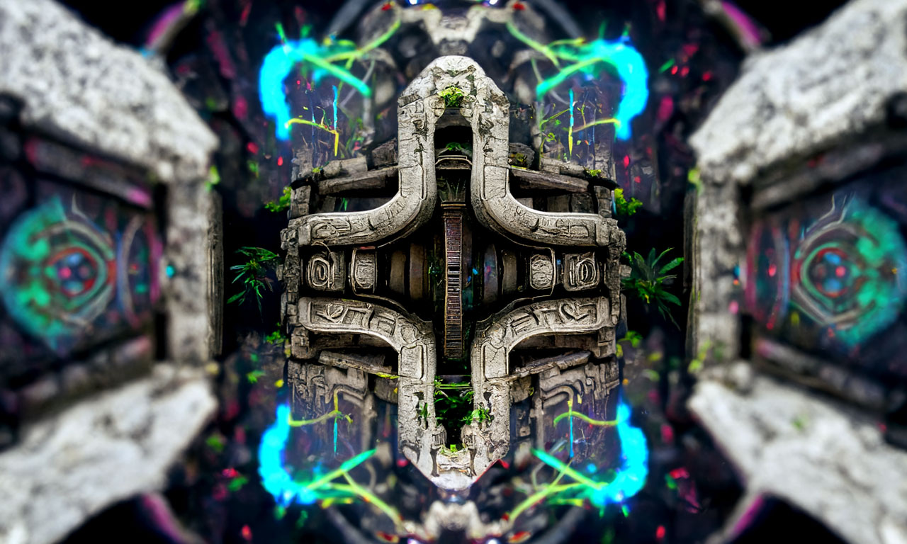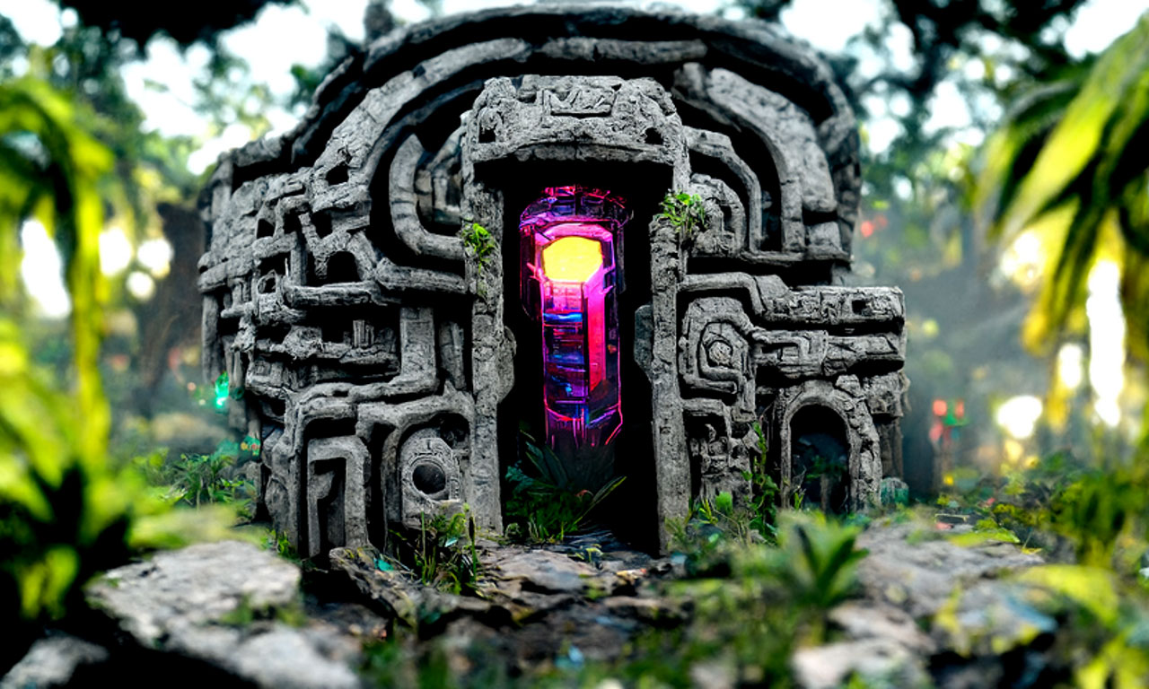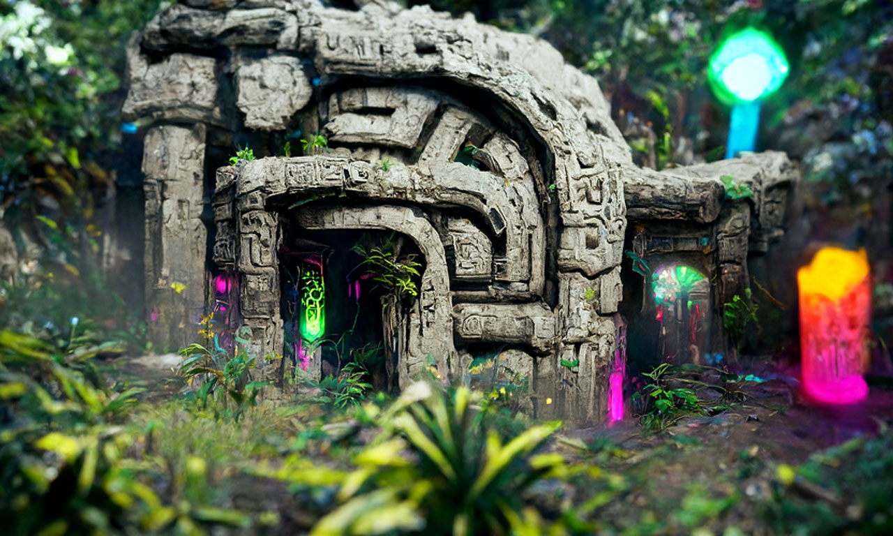 Prompt: Detailed neon portal to another universe, Aztec Ruins in the jungle by Tyler Edlin trending on Artstation ultra HD, Unreal Engine